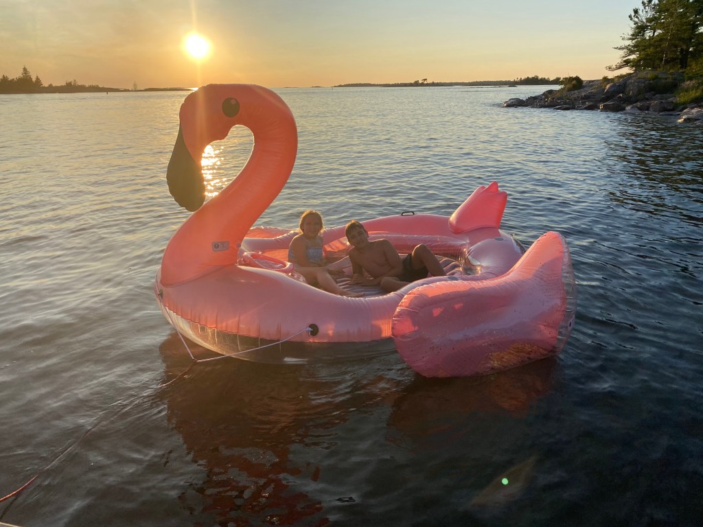 But here’s where I digress for just a little bit . . . over the past few days I put all the Christmas decorations away, and started a good cleaning up/out of the house. In doing so, I realized that it was really time to update some of the photos I had on display and between ordering new picture frames deciding what frames needed new photos, I got to looking at all the pictures from the past twelve months. And it turns out . . . that despite feeling like I somehow worried the year away . . . we did have some pretty great times. From family movie nights, to an extended stay at the cottage, and even a stint “Glamping”, there was a lot of happiness that we had this year, and some of it that we maybe wouldn’t have had in the absence of the disruption that was COVID. For all my being dragged down into the pit of COVID anxiety, it was actually a year filled with wonderful moments – including many with our new pal RosĂ© – the giant inflatable flamingo – complete with glitter in her wings!
